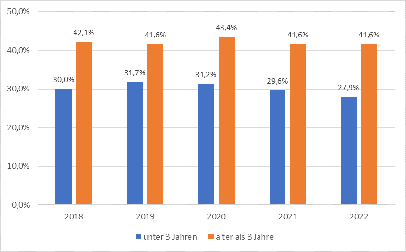 Im Jahr 2022 besuchten insgesamt 1.882 Kinder unter 3 Jahren Kindertageseinrichtungen im Landkreis Rastatt. Von ihnen hatten 526 Kinder eine Migrationsgeschichte, was einem Anteil von 27,9 % entspricht. Dies markiert den niedrigsten Wert innerhalb der letzten 5 Jahre (2018-2022). Im Vergleich dazu betrug der Anteil im Vorjahr 2021 noch 29,6 %. Diese Zahlen verdeutlichen, dass der Anteil der Kinder mit Migrationsgeschichte im Jahr 2022 leicht zurückgegangen ist.