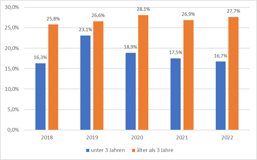 Anteil der Kinder unter 3 Jahren bzw. 3 Jahre und älter in Kindertageseinrichtungen mit nichtdeutscher Familiensprache an allen Kindern dieser Altersgruppe in Kindertageseinrichtungen.
