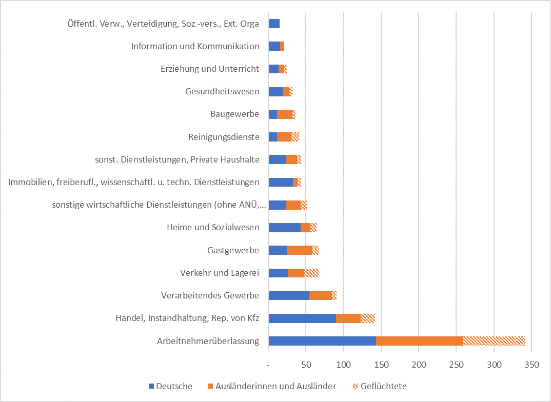 Im Jahr 2022 erfolgten die meisten Integrationen in den Arbeitsmarkt über Arbeitnehmerüberlassungen - 342 Personen, von denen 58,2 % Ausländerinnen und Ausländer waren, darunter auch Geflüchtete. Auf Platz 2 folgte der Handel, die Instandhaltung und Reparatur von Kfz mit 142 Personen (davon 36,6 % Ausländerinnen und Ausländer einschließlich Geflüchtete) sowie das verarbeitende Gewerbe mit 91 Personen (davon 39,6 % Ausländerinnen und Ausländer einschl. Geflüchtete). In die Branchen wie Verkehr und Lagerei, Reinigungsdienste, Gast- sowie Baugewerbe wurden anteilig mehr Personen mit ausländischer Staatsangehörigkeit als Deutsche integriert.